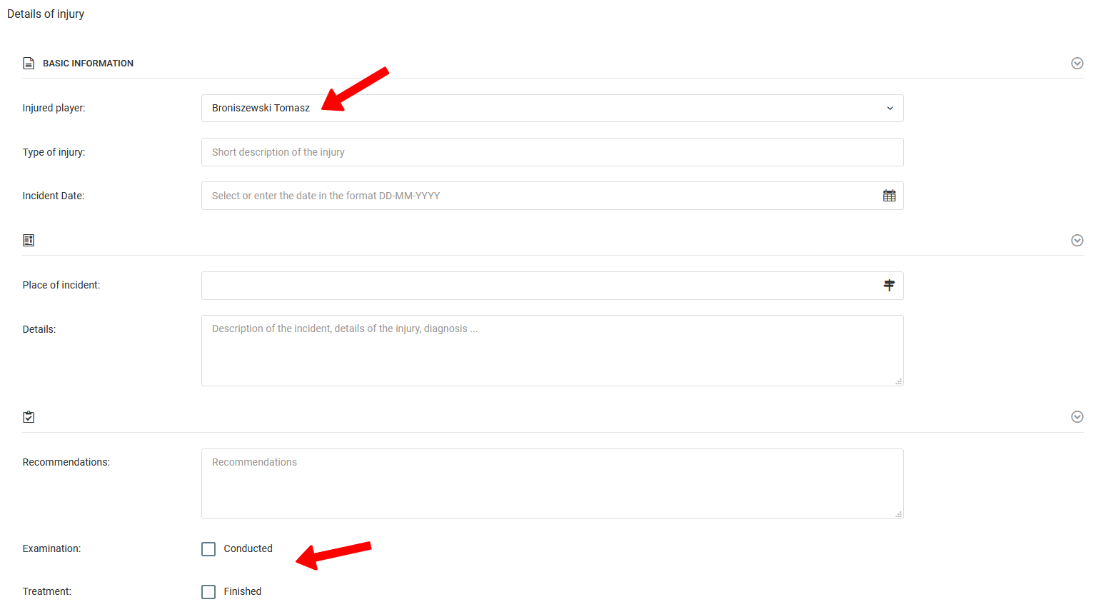 Pro přidání zranění vyberte v levém menu deník zranění přidat zranění. Vyplňte údaje požadované ve zobrazeném formuláři, začněte jménem zraněného hráče. Zadané zranění lze kdykoli upravit, např. pro nastavení data kontroly nebo ukončení léčby.
