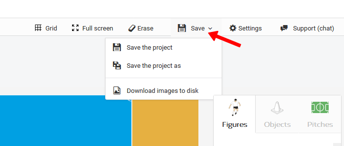 Das System bietet Ihnen drei Speicheroptionen. Um eine davon auszuwählen, klicken Sie auf die Schaltfläche "Speichern" im oberen Funktionsmenü. Die erstellte grafische Zeichnung kann als Projekt, als Variation des aktuell geöffneten Projekts oder als PNG-Datei auf Ihrem Computer gespeichert werden. Die gespeicherten Projekte erscheinen in Ihrer privaten Übungsbibliothek.