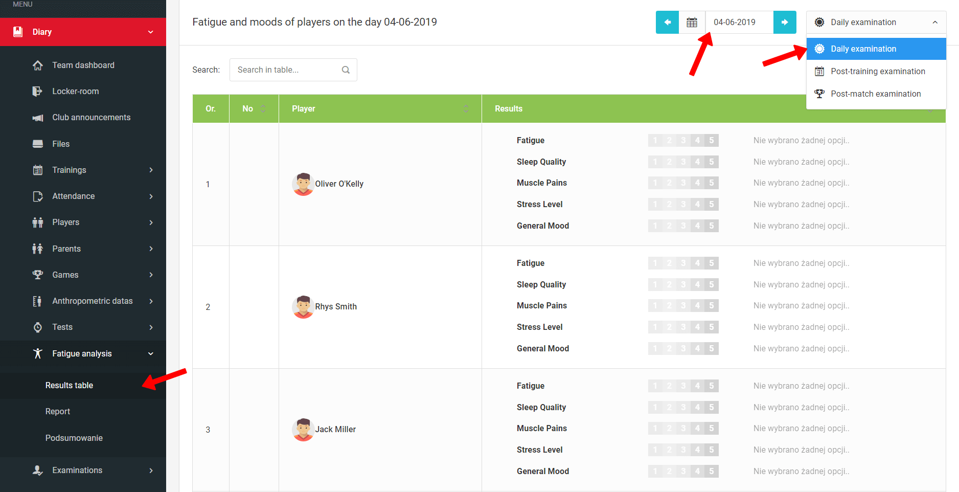 In Ausnahmefällen, wenn die Spieler keine Daten über die mobile Anwendung übertragen, haben Sie die Möglichkeit, diese manuell über das System einzugeben. Wählen Sie dazu aus dem linken Menü Tagebuch Ermüdungsanalyse Ergebnistabelle.