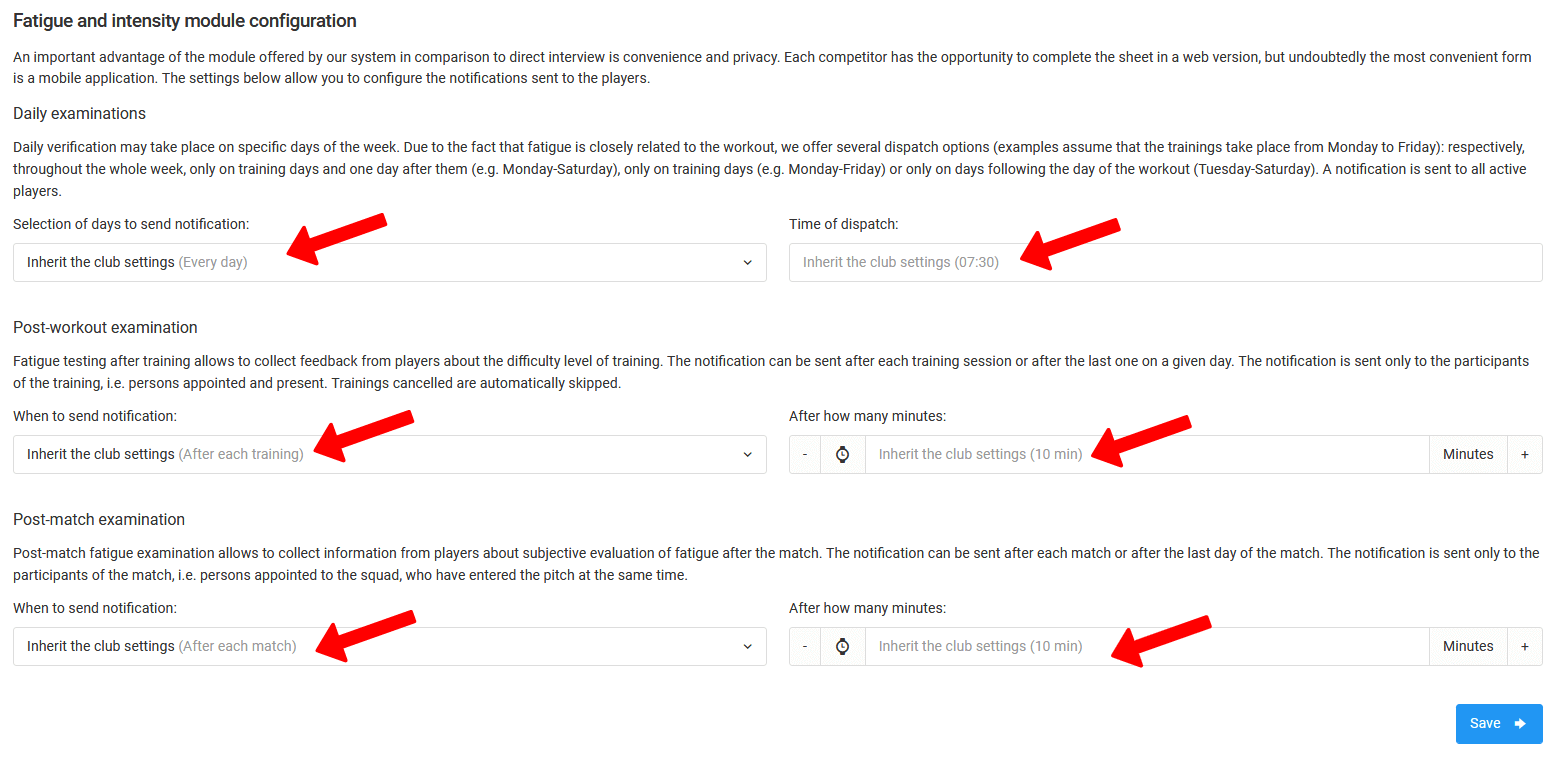 Die Konfiguration der Benachrichtigungen basiert auf den drei Typen. Bei der täglichen Umfrage haben Sie folgende Optionen im Auswahlfeld der Tage, an denen der Spieler benachrichtigt werden soll: aus, täglich, an Trainingstagen + Tag danach, nur an Trainingstagen oder nur an Tagen nach dem Training. Für die Ermüdungsanalyse nach dem Spiel und nach dem Training haben Sie zwei Optionen, um die Benachrichtigung zu senden: nach jedem Spiel/Training oder nach dem letzten Spiel/Training des Tages. Außerdem müssen Sie die Benachrichtigungszeit (täglicher Test) und die Zeit in Minuten nach dem Training/Spiel festlegen. Nachdem Sie die Daten in allen Feldern ausgefüllt haben, klicken Sie auf den blauen "Speichern"-Button.