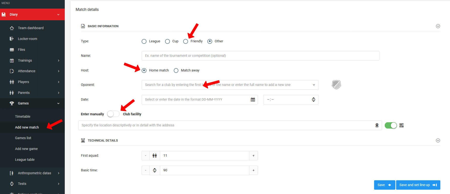 Um ein einzelnes Spiel zu Ihrem Zeitplan hinzuzufügen, klicken Sie im linken Menü auf Tagebuch Spiele Neues Spiel hinzufügen. Nach dem Klicken auf diesen Link werden Sie zum Fenster für die Spielerstellung weitergeleitet. Füllen Sie die wenigen Felder aus, die im Formular erscheinen. Denken Sie daran, die Art des Spiels, den Gegner, das Datum, die Uhrzeit und den Ort anzugeben. Was den Ort betrifft, können Sie ihn manuell eingeben oder vordefinierte Objekte verwenden, die vom Administratorkonto eingegeben wurden. Nachdem Sie alle Felder ausgefüllt haben, speichern Sie das Formular und fahren Sie mit der Vervollständigung der Spielaufstellung fort.