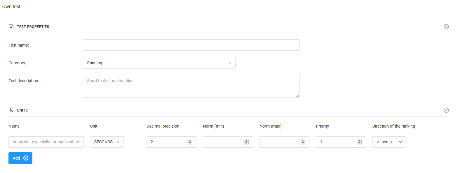 Um einen Test zu erstellen, wählen Sie aus dem linken Menü: Tagebuch Tests Neuen Test erstellen. Dann öffnet sich das Fenster zur Testerstellung. In diesem Fenster haben Sie mehrere wichtige Felder auszufüllen. Das erste ist der Name des Tests, das nächste ist die Kategorie und Beschreibung des Tests. Darunter befindet sich ein Feld zur Eingabe von Informationen darüber, was Sie messen, welche Maßeinheit und welche Standards der Test hat. Sie haben auch die Möglichkeit, mehrdimensionale Tests zu erstellen, indem Sie weitere Faktoren hinzufügen, die in einem bestimmten Test gemessen werden. Um einen weiteren Faktor hinzuzufügen, klicken Sie auf die blaue Schaltfläche "Hinzufügen".