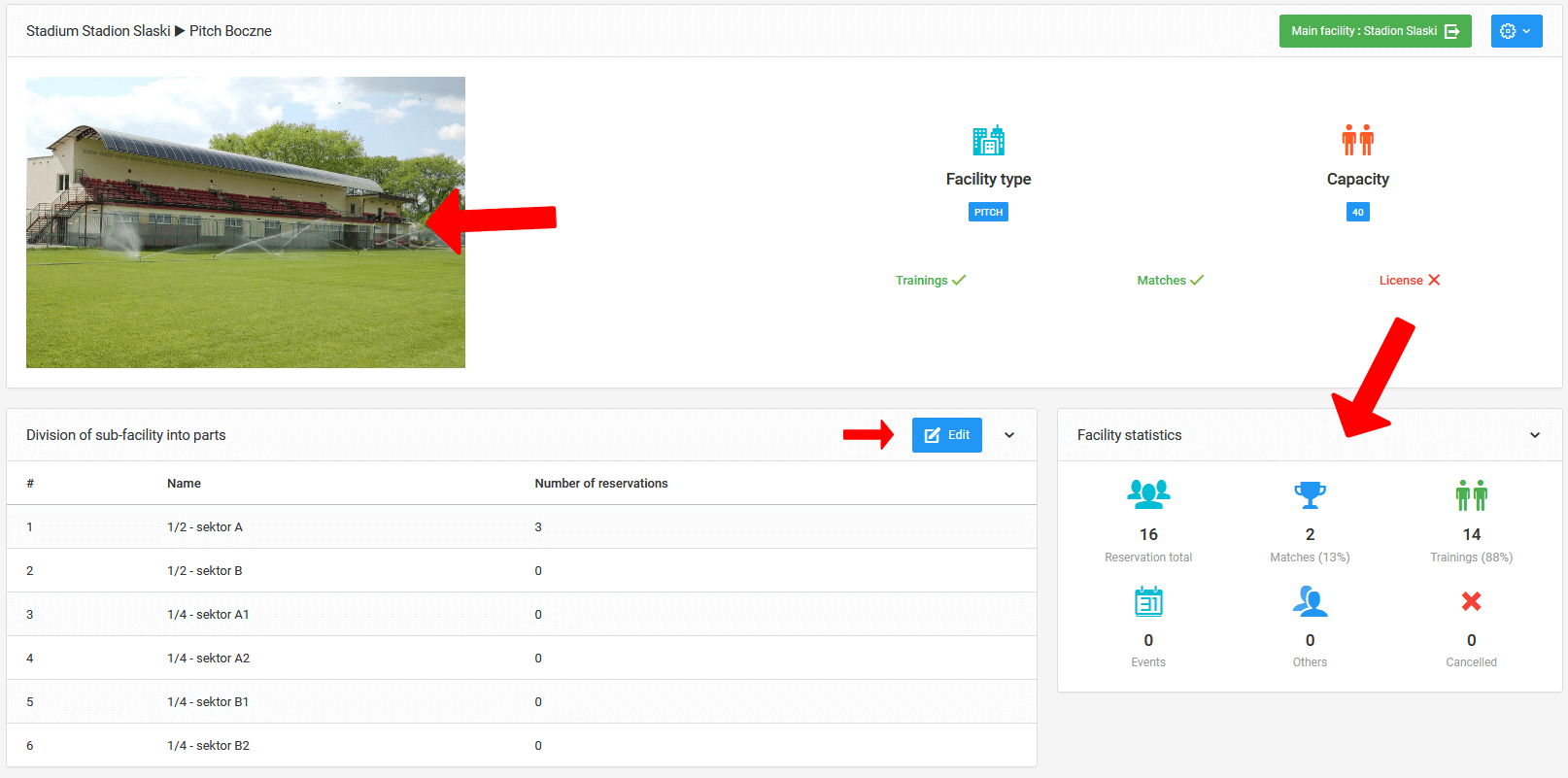 Στην προεπισκόπηση μιας δεδομένης εγκατάστασης μπορείτε να δείτε τις πιο σημαντικές πληροφορίες: στοιχεία επικοινωνίας, φωτογραφίες και στατιστικά στοιχεία πληρότητας Από εδώ έχετε επίσης τη δυνατότητα να διαιρέσετε την δευτερεύουσα εγκατάσταση, π.χ. γήπεδα σε ζώνες, που σημαίνει ότι ένα γήπεδο μπορεί να χωριστεί σε δύο μισά.
