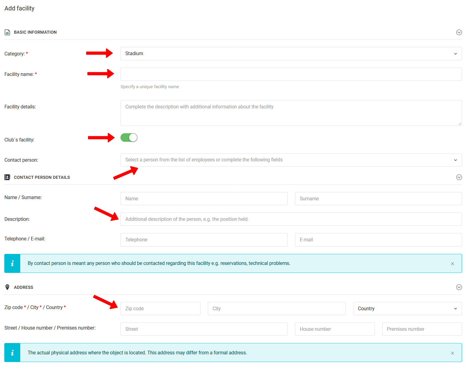 Formā ir daži svarīgi lauki, kas jāaizpilda. Pirmais ir objekta tipa izvēle. Jūs varat izvēlēties starp stadionu, treniņu centru, skolu utt. Nākamais lauks, kas jāaizpilda, ir objekta nosaukums un apraksts. Tad norādiet, vai objekts pieder klubam, ja jums jāizvēlas kontaktpersona, ja nē, ievadiet objekta īpašnieka un kontaktpersonas datus. Pēdējā solī aizpildiet pilnu, precīzu adresi objektam, ko ievadāt sistēmā.