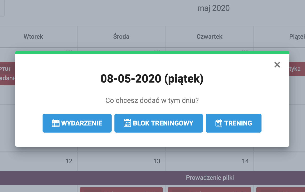 Jako administrator systemu masz możliwość dodania na kalendarz klubowy trzech typów wydarzeń. Tradycyjne wydarzenie, blok treningowy oraz trening. Aby dodać wydarzenie na kalendarz, kliknij w dowolną dzień na kalendarzu i wybierz jedną z trzech opcji, które pojawią się na ekranie.