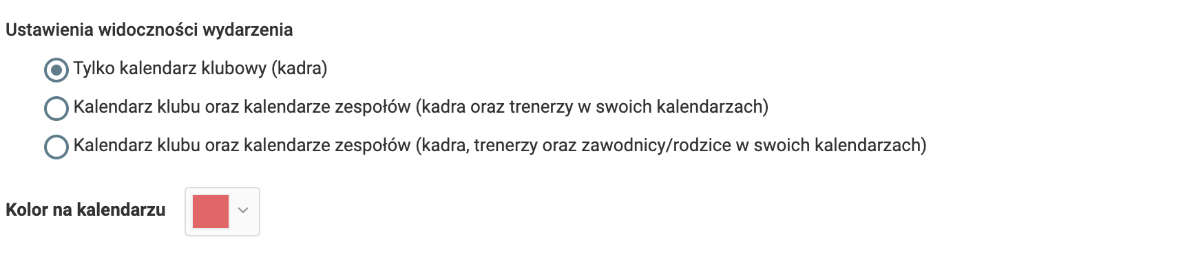 Dodanie standardowego wydarzenia, polega na naniesieniu na kalendarz klubowy eventu o dowolnym charakterze, jak np. zebranie trenerów. Tworząc tego typu wydarzenie możesz wybrać jego widoczność dla poszczególnych grup użytkowników. Dla poprawy widoczności wydarzenia masz także możliwość wybrania jego koloru.