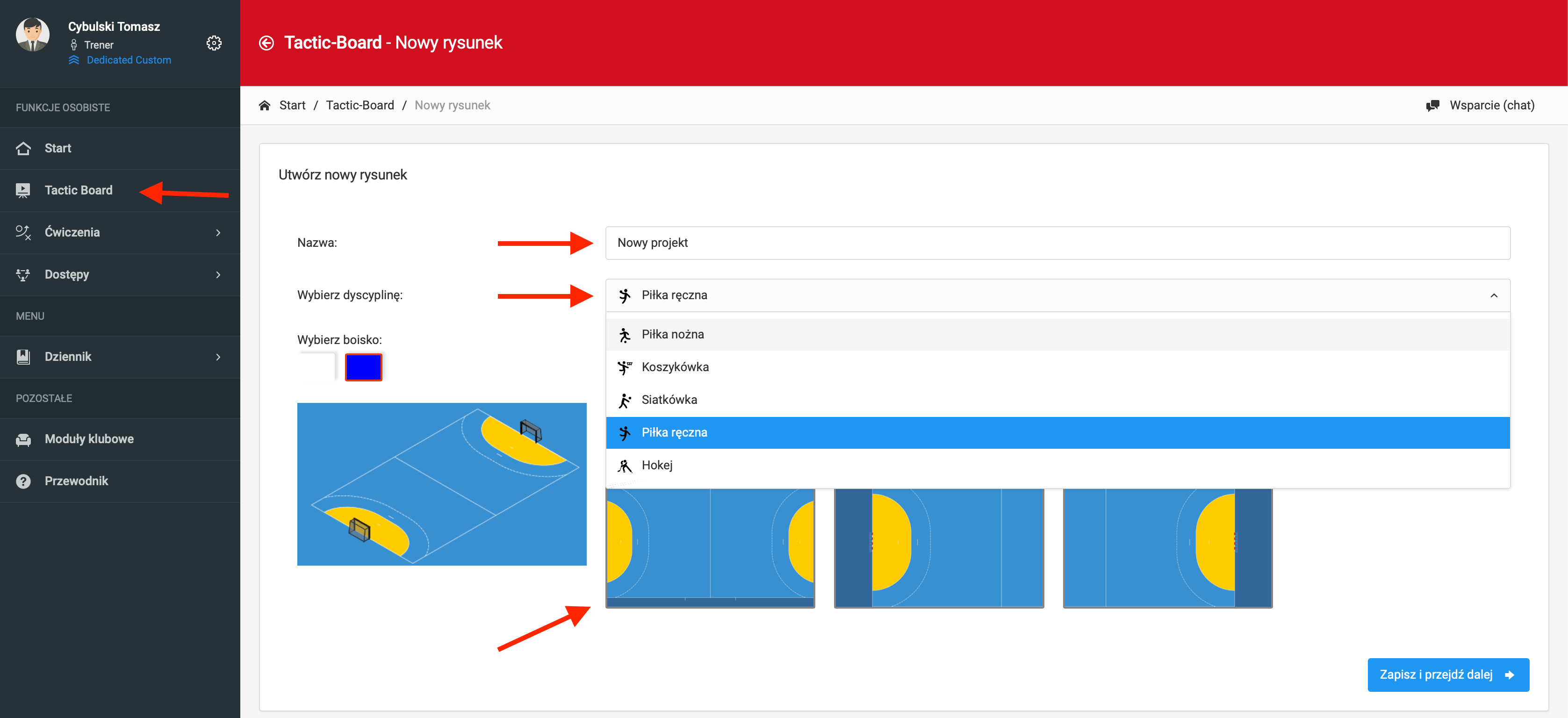 Aby przejść do tworzenia nowego projektu, należy z lewego menu wybrać opcję "Tactic Board". W kolejnym korku musisz określić parametry nowego projektu. Są to: nazwa, wzór boiska oraz dyscyplina sportu, która warunkuje dostępne widoki boisk.