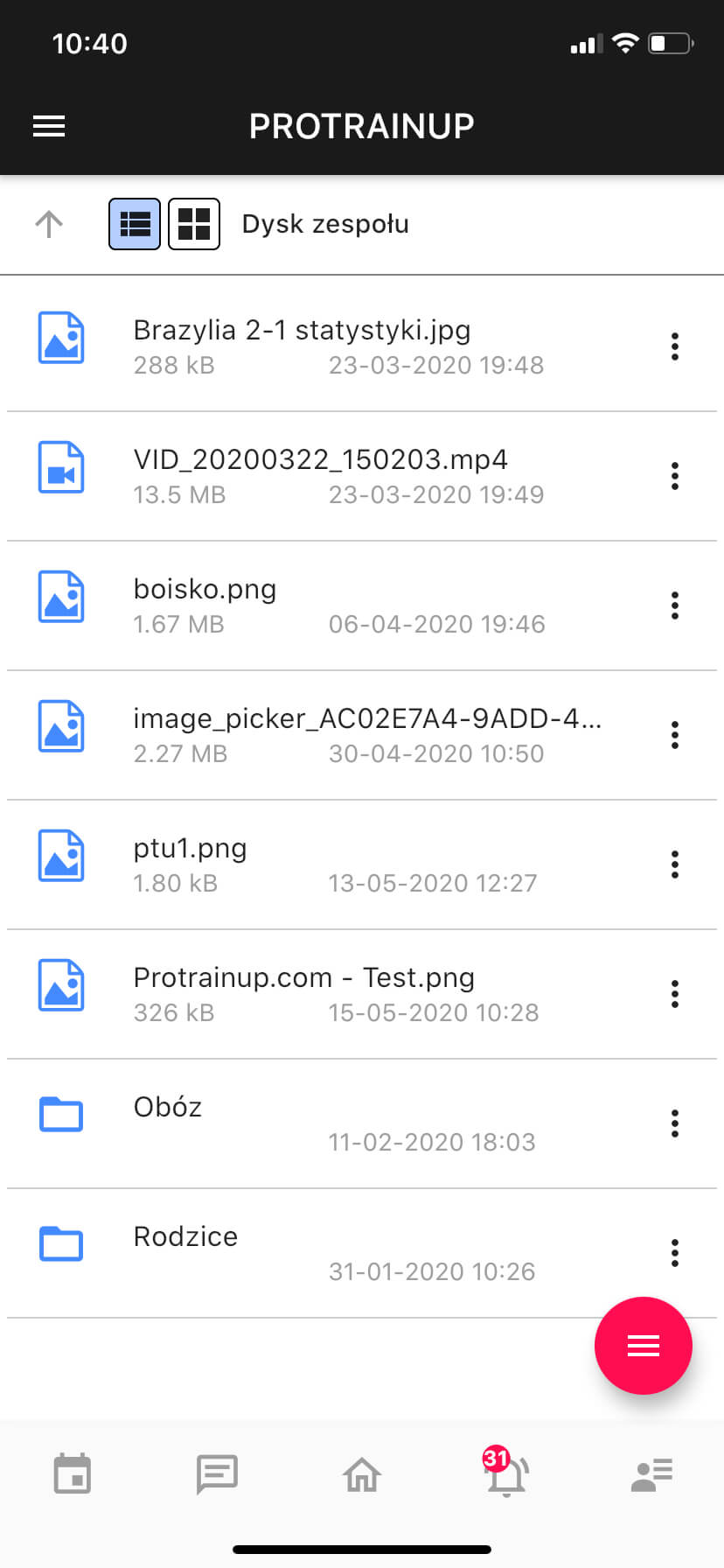 Dodawanie plików do dysków odbywa się dwojako. Pierwszy sposób, to dodanie pliku w szatni lub na tablicy. Tak dodany plik automatycznie ląduje na wirtualnym dysku. Druga opcją to przeciągniecie pliku z dysku komputera do wirtualnego dysku ProTrainUp. Usuwanie pliku odbywa się poprzez wybranie opcji "usuń" z menu kontekstowego danego pliku/folderu.