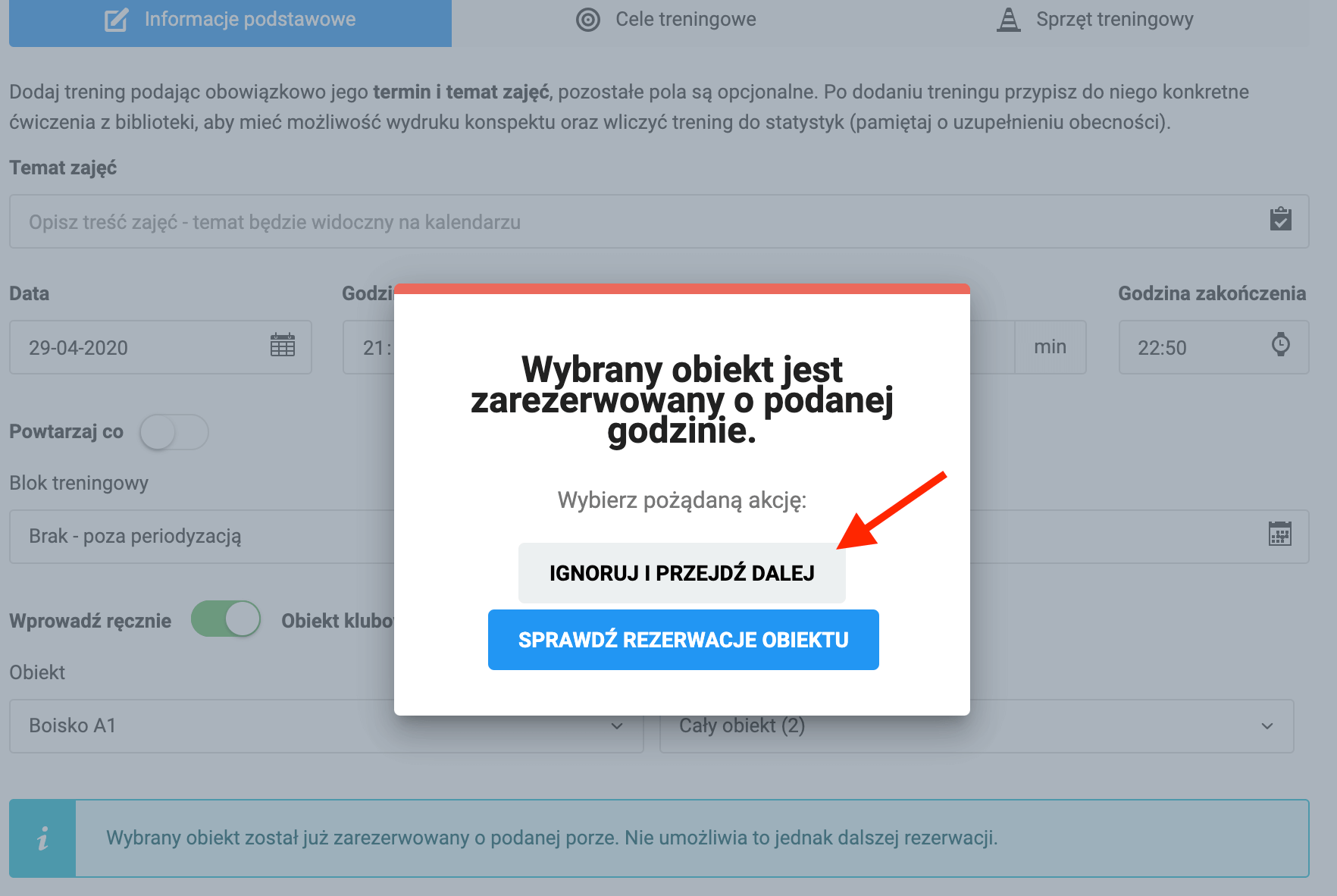 Okienko, które pojawi się na ekranie przy okazji dodawania treningu lub meczu dajce Ci dwie opcje: zignorowanie konfliktu terminów i utworzenie go oraz druga opcja: możliwość sprawdzenia terminarza rezerwacji obiektu. Dzięki temu będziesz w stanie sprawdzić, kto w danym terminie rezerwuje obiekt i ewentualnie ustalić zmiany w harmonogramie zajęć.