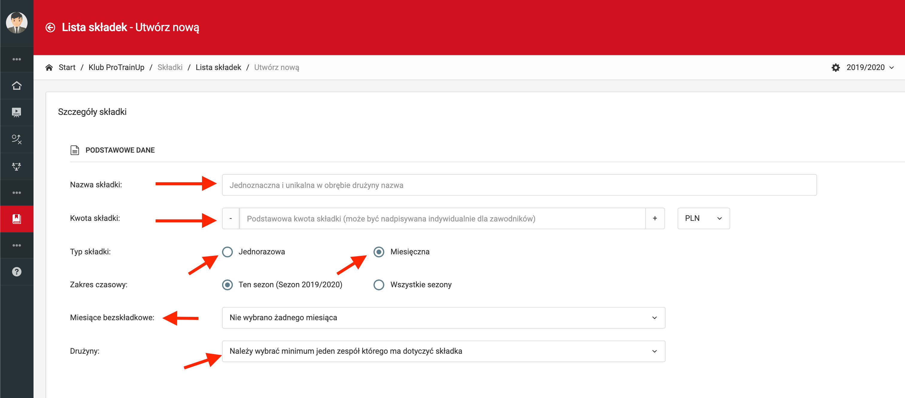 System daje możliwość tworzenia dwóch typów składek: składka jednorazowa oraz składka miesięczna. Przed stworzeniem składek, dobrą praktyką jest zakończenie procesu ustalania list zawodników w poszczególnych drużynach oraz utworzenie wszystkim zespołom aktywnego sezonu. Bez utworzonego sezonu nie będziesz mógł przypisać drużynie składki. Stworzenie składki jest możliwe zarówno z poziomu trenera, jak i administratora konta klubowego. Tworząc składkę jako trener możesz ją przypisać jedynie do zespołu, który prowadzisz. Robiąc to jako administrator, możesz utworzyć składkę dla wszystkich drużyn za jednym razem. Aby przejść do tworzenia składki, jako trener wybierz z lewego menu dziennik składki utwórz nową. Natomiast chcąc stworzyć składkę z poziomu administratora, z lewego menu wybierz klub składki utwórz nową.