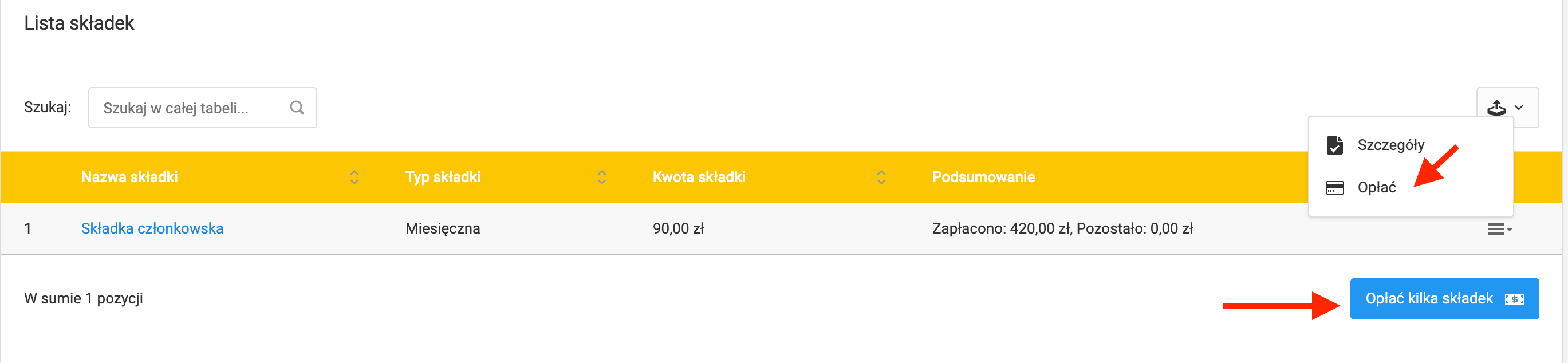Użytkownik posiada dwie opcje opłacenia składki poprzez system: szybką i manualną/masową. Szybka polega na wybraniu z menu przy danej składce opcję "zapłać", która przeniesie użytkownika bezpośrednio do realizowania płatności. Druga opcja to opłacenie kilka składek jednocześnie. Aby wybrać tę opcję, kliknij w niebieski przycisk "opłać kilka składek". Po kliknięciu, wybierz które składki chcesz opłacić. W kolejnym kroku wprowadź kwoty dla poszczególnych składek, miesięcy, itp. Następnie przejdź do płatności, wybierz odpowiedni sposób i dokonaj przelewu. Płatność jest również możliwa z poziomu aplikacji mobilnej.
