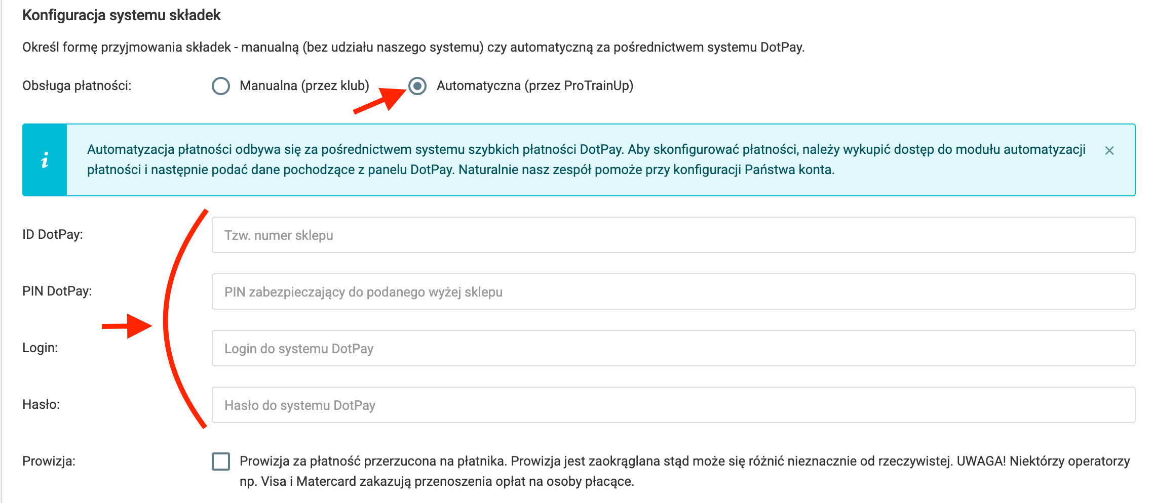 Trzecią opcją księgowania w systemie płatności jest uruchomienie możliwości opłacania składek bezpośrednio w systemie ProTrainUp. Taka możliwość jest wtedy dostępna zarówno poprzez aplikację mobilną, jaki przez przeglądarkę internetową. Przed uruchomieniem tej opcji musisz jednak wykonać szereg formalnych działań w imieniu klubu w celu utworzenia oraz autoryzowania swojego konta w serwisie Przelewy24.