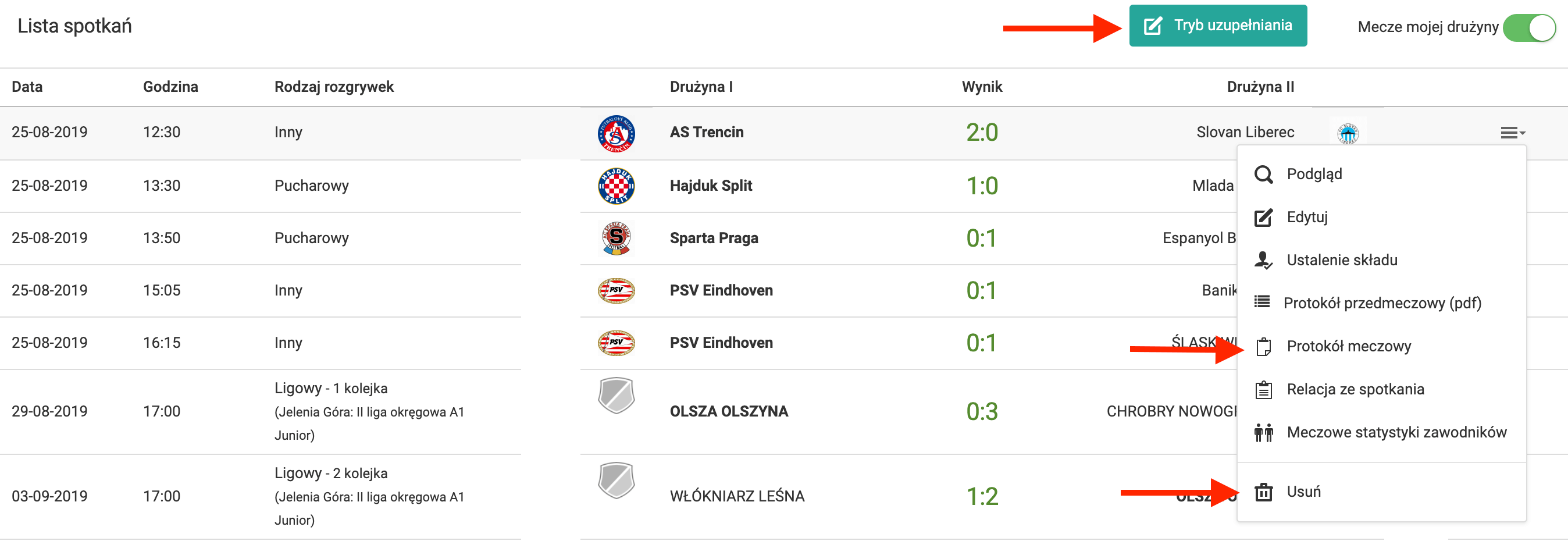 Wracając do wyniku - masz dwie opcje jego uzupełnienia. Podstawową oraz zaawansowaną. Pierwsza z nich, to możliwość wprowadzenia wyłącznie wyniku mecz. Aby ją wywołać kliknij w zielony przycisk "tryb uzupełnienia". Druga, zaawansowana opcja dostępna będzie z poziomu menu danego meczu (ostatnia kolumna w tabeli). Aby przejść do zaawansowanego uzupełniania wyniku meczu, wybierz z menu opcję "protokół meczowy".