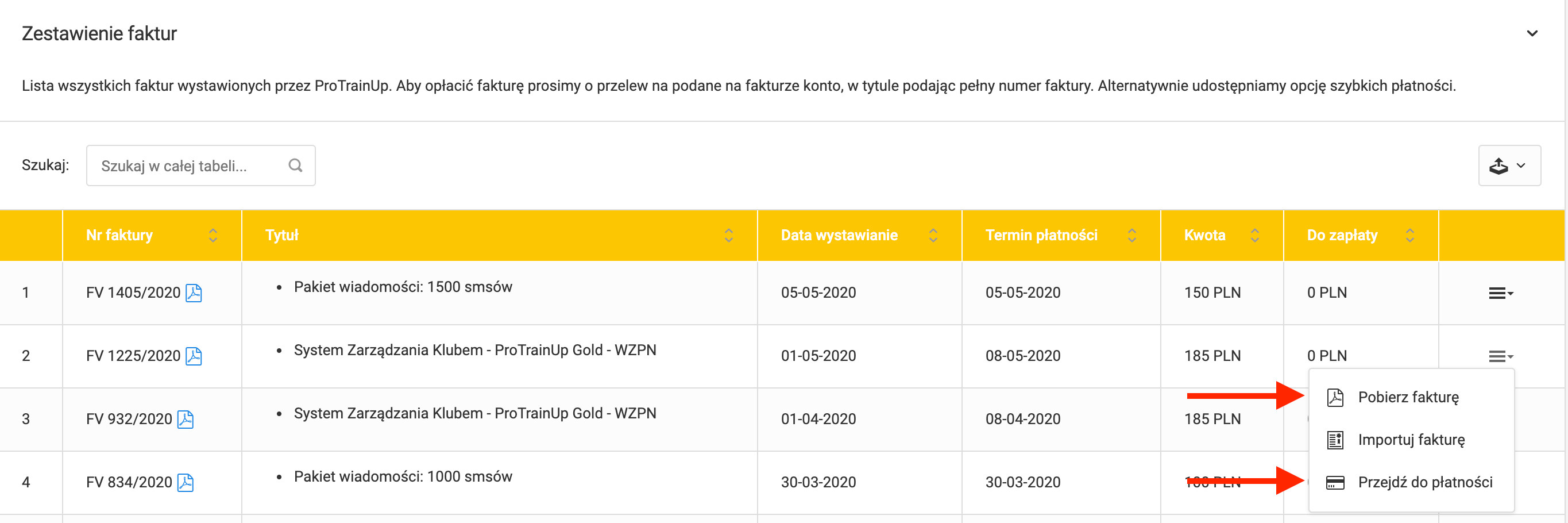 W zależności od posiadanej licencji system oferuje kilka opcji dotyczących Twoich faktur oraz płatności. W przypadku faktur za licencje klubową lub dodatkowe pakiety sms/e-mail, to pojawiają się one w zakładce klub finanse.