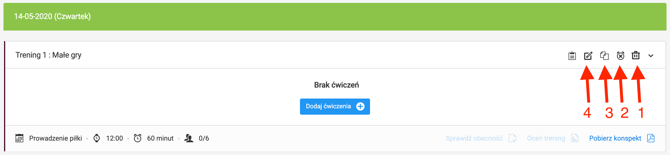 Powyżej każdego treningu, w prawym górnym rogu znajdują się dodatkowe opcje, które możesz w każdej chwili wykorzystać. Pierwsza z nich (1) to całkowite usunięcie treningu, druga (2) to odwołanie treningu. Klikając tę ikonkę pojawi się okienko, w którym będziesz mógł podać powód odwołania treningu oraz zaznaczyć opcję wysyłki powiadomienia do jego uczestników. Trzecia pozycja (3) to kopiowanie treningu. Dzięki temu będziesz mógł skopiować trening nie tylko z dnia na dzień ale także między drużynami, które prowadzisz. Czwarta ikonka (4) otwiera okno edycji treningu.
