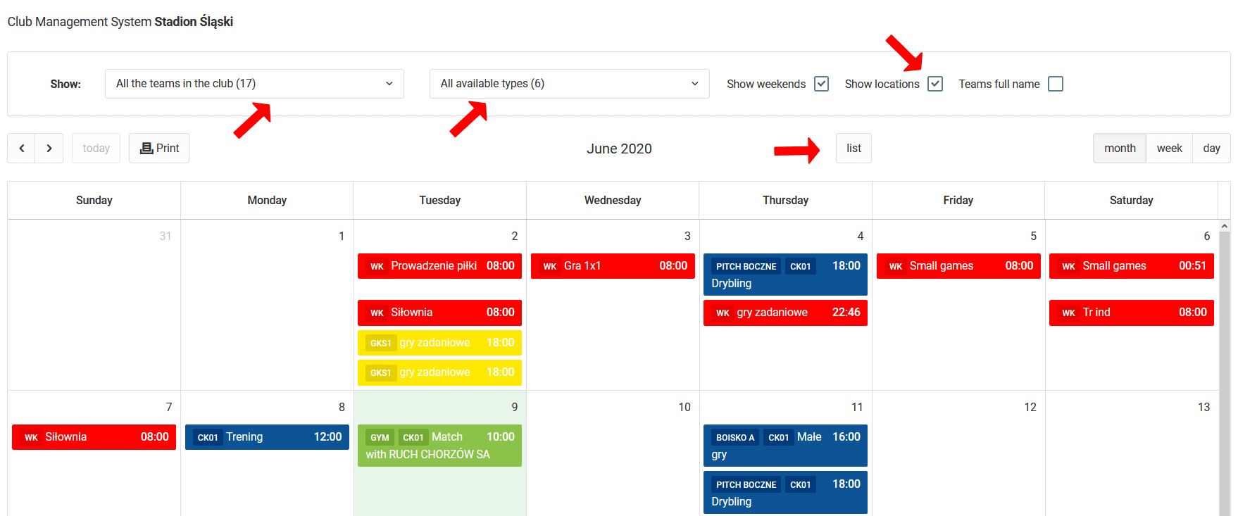 Como você pode ver na imagem acima, há uma área sobre o calendário onde você tem várias opções para filtrar eventos no calendário. Você pode limitar o intervalo de eventos exibidos a times específicos ou tipos específicos. Além disso, você pode decidir se os fins de semana, nomes completos dos times e locais dos eventos devem aparecer no calendário.