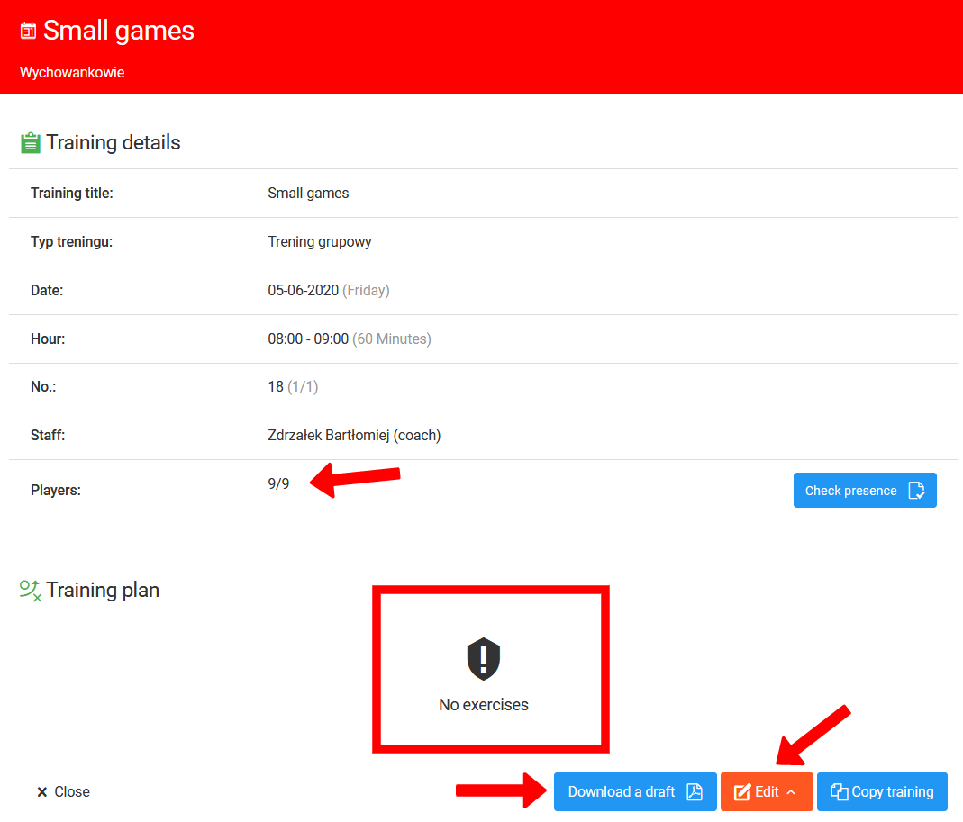Outro recurso importante que você encontrará no calendário do seu clube é a capacidade de controlar os detalhes de cada treino adicionado. Ao clicar em uma sessão de treino no calendário, você verá uma janela com os detalhes da sessão. Rapidamente, você poderá verificar se o treinador preparou um rascunho ou conferiu a presença.