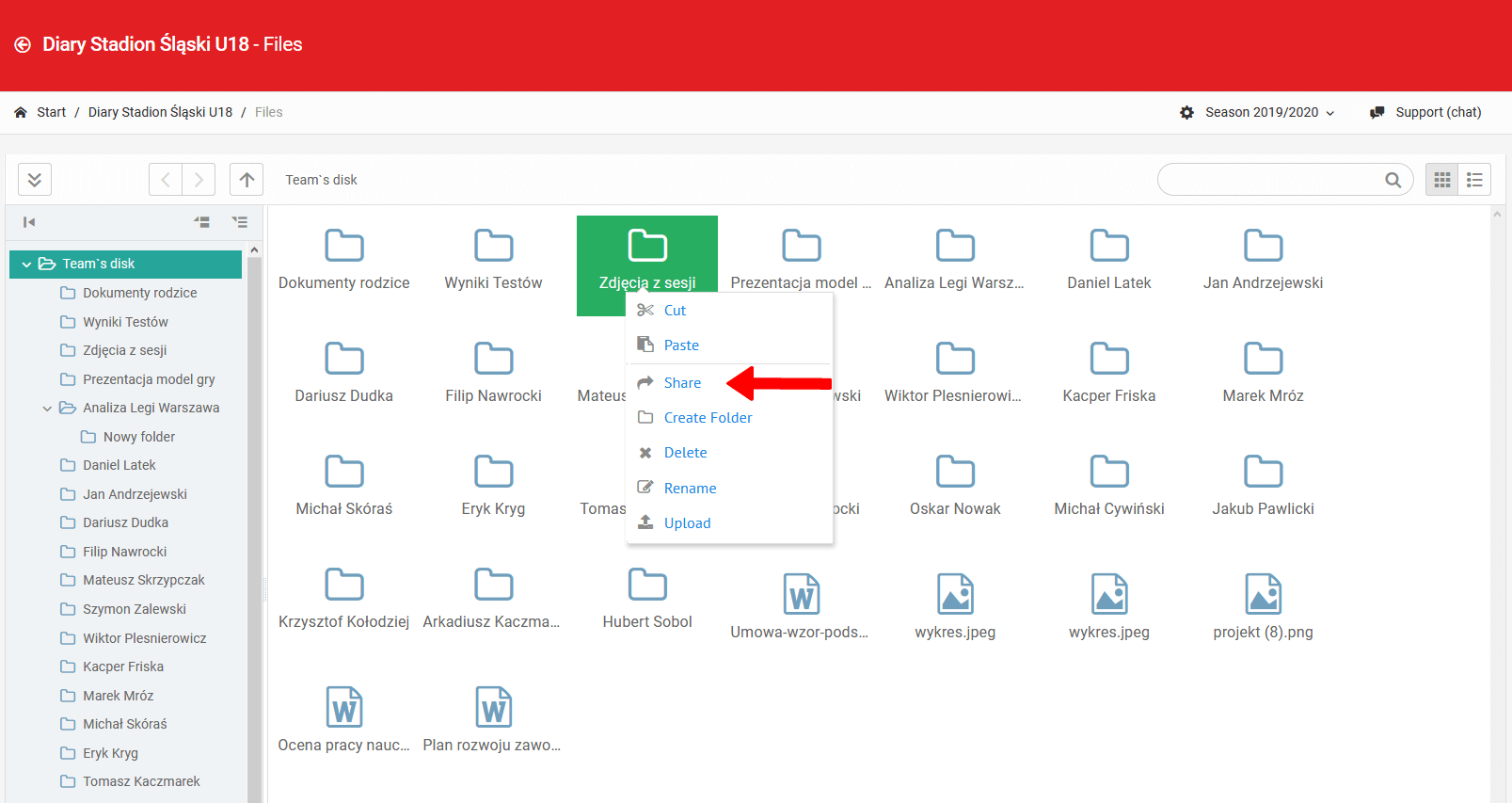 Os detentores da licença relevante têm acesso ao módulo de gerenciamento de documentos. Ele consiste em dois elementos. O primeiro é um disco visível apenas para funcionários. O segundo são os arquivos aos quais jogadores, pais e equipe de um determinado time têm acesso. A partir dos arquivos da equipe, a comissão técnica tem a capacidade de compartilhar certas pastas com grupos de usuários selecionados (jogadores, pais).