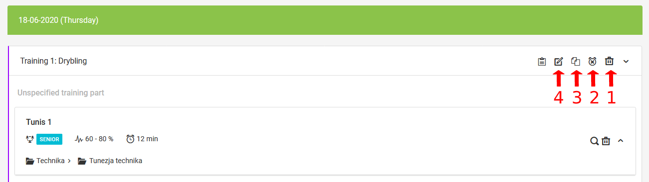 Acima de cada sessão de treino, no canto superior direito, há opções adicionais que você pode usar a qualquer momento. A primeira (1) é excluir completamente o treino, a segunda (2) é cancelar o treino. Ao clicar neste ícone, aparecerá um pop-up onde você pode especificar o motivo do cancelamento do treino e marcar a opção de enviar uma notificação aos participantes. A terceira posição (3) é para copiar o treino. Isso permitirá que você copie o treino não apenas de dia para dia, mas também entre as equipes que você está liderando. O quarto ícone (4) abre a janela de edição do treino.